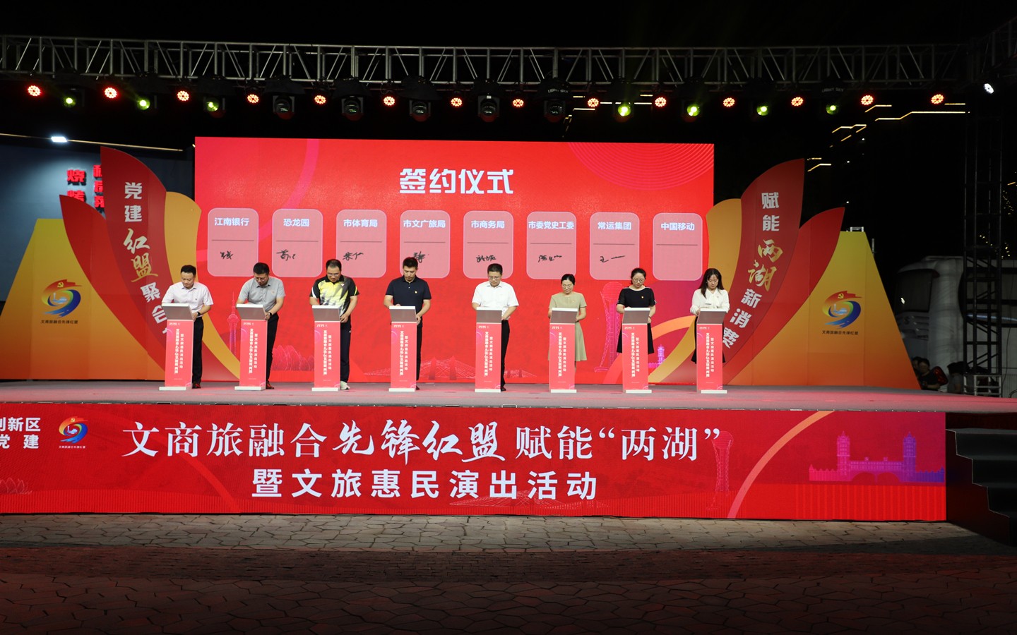 9月13日晚,“黨建紅盟聚合力、賦能兩湖新消費”文商旅融合先鋒紅盟賦能“兩湖”暨文旅惠民演出活動在藍海豚文化藝術街區(qū)成功舉行。市級機關工委書記趙天晟,副書記潘奕,市文廣旅局黨組書記、局長嚴俊,市商務局黨組書記、局長韓雪琴,市黨史工委主任柯善學等領導出席活動;金壇、武進、鐘樓區(qū)文旅(體育)、商務、黨史部門領導及恐龍園、江南銀行、常州移動等紅盟單位重點企業(yè)領導參加活動。集團公司黨委書記、總經(jīng)理朱平春、副總經(jīng)理黃細富等領導及街區(qū)商管公司相關人員參加活動。