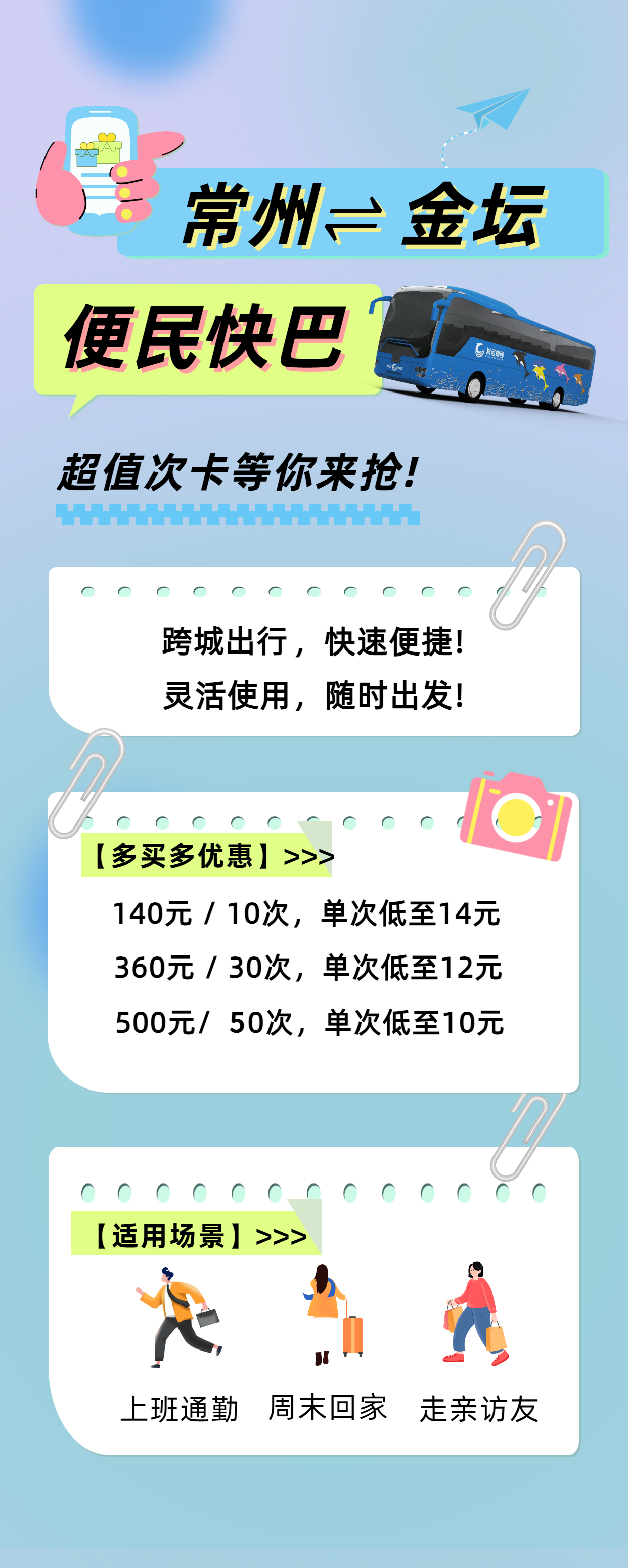 為進一步提升出行體驗,常州至金壇便民快巴近日推出超值次卡,為廣大市民提供更加優(yōu)惠、便捷的出行選擇。此次推出的次卡共分為三檔:140元10次、360元30次、500元50次,具體購買及使用方式可關(guān)注“常州汽車站”公眾號了解詳情。